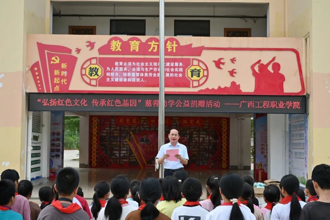 為弘揚(yáng)紅色精神,踐行公益使命,助力教育事業(yè)發(fā)展,2025年4月29日,廣西工程職業(yè)學(xué)院赴平果市吉祥小學(xué)開展“弘揚(yáng)紅色文化 傳承紅色基因”慈善助學(xué)捐贈活動,捐贈圖書及學(xué)習(xí)用品等,為孩子們送去了學(xué)習(xí)物資與關(guān)懷,希望孩子們通過紅色文化的浸潤,博覽群書,增長知識面,奮發(fā)向上,實現(xiàn)人生夢想?;顒佑善焦忻裾峙c平果市慈善促進(jìn)會主辦。我校副校長黃德偉、團(tuán)委副書記李麗清及教師代表參加了捐贈活動