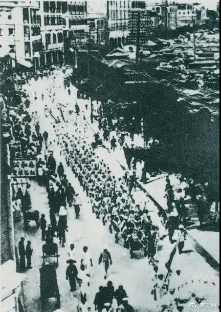 從1925年6月19日起,香港和廣州租界的20萬工人舉行罷工,聲援上海人民的反帝斗爭。23日,廣州和由香港回廣州的工人10萬余人舉行大游行,在沙基慘遭英、法帝國主義的鎮(zhèn)壓。圖為當(dāng)時的游行隊伍。