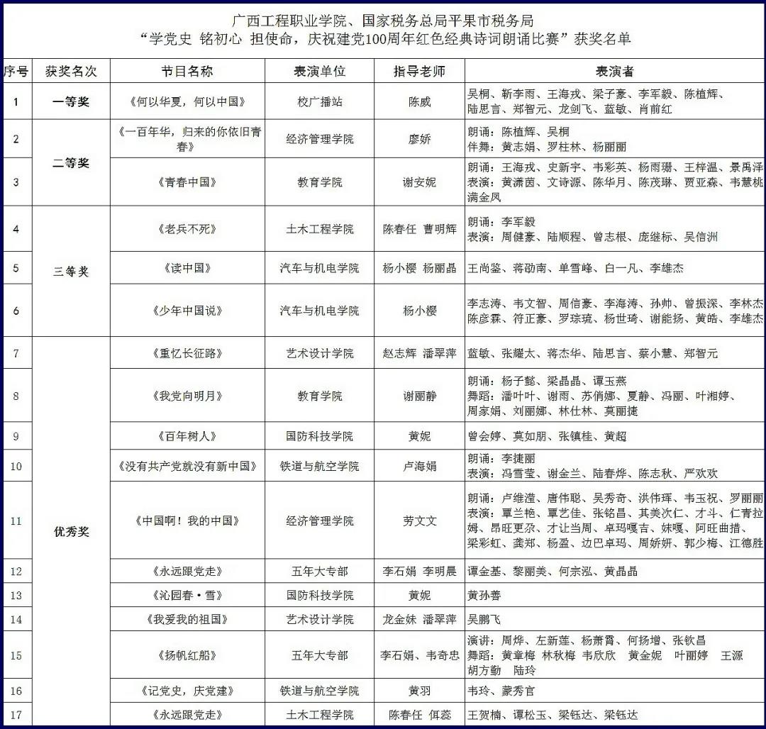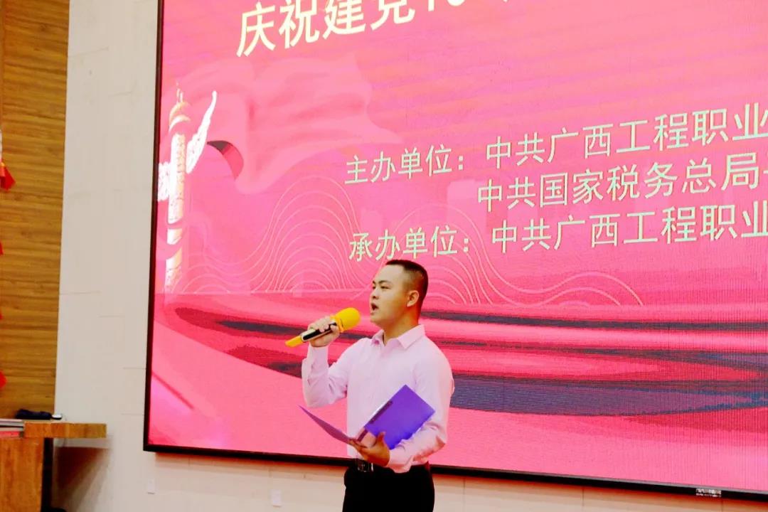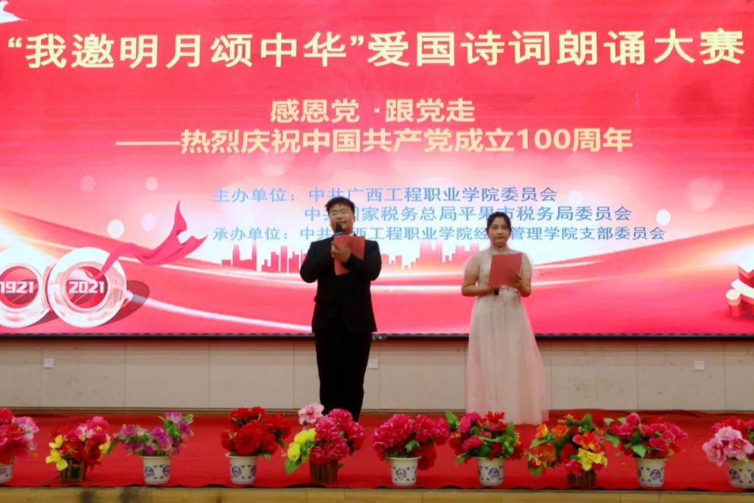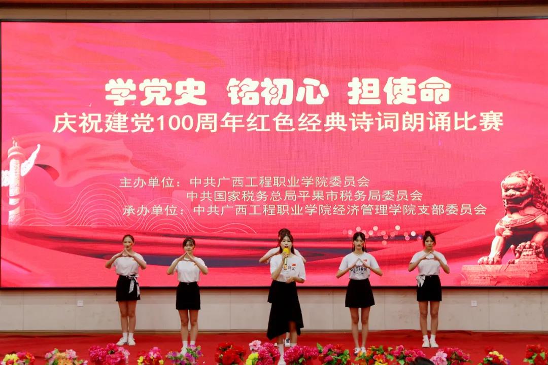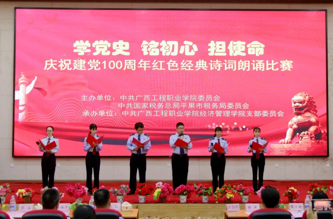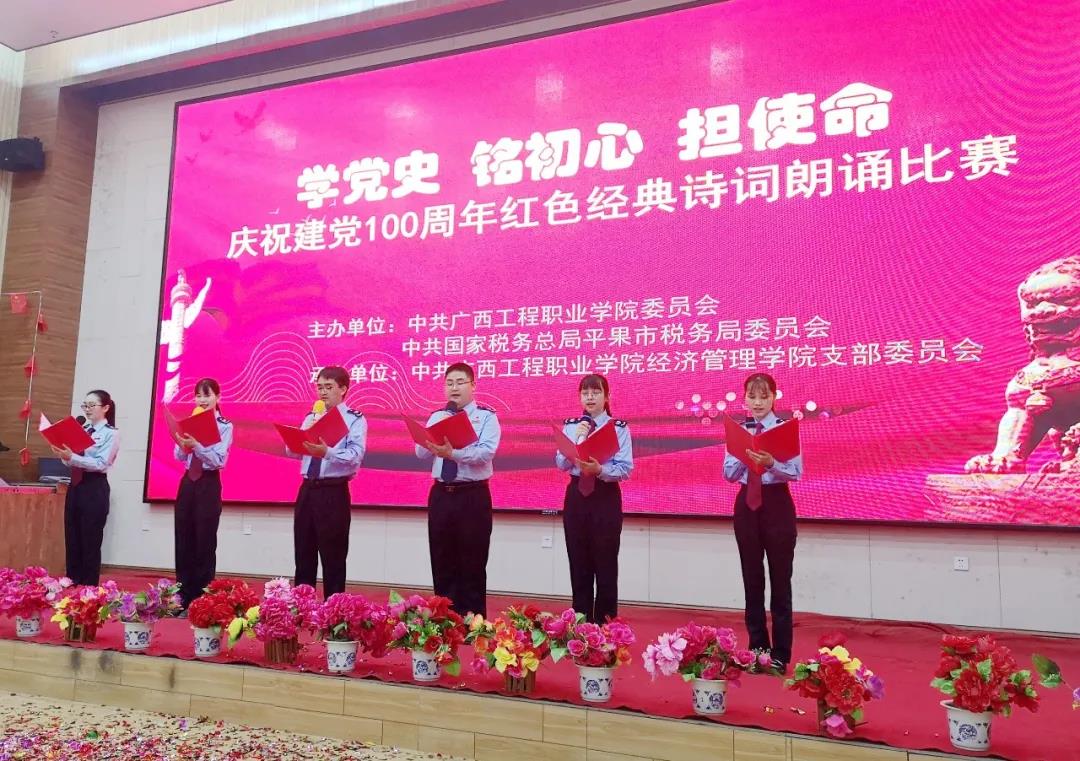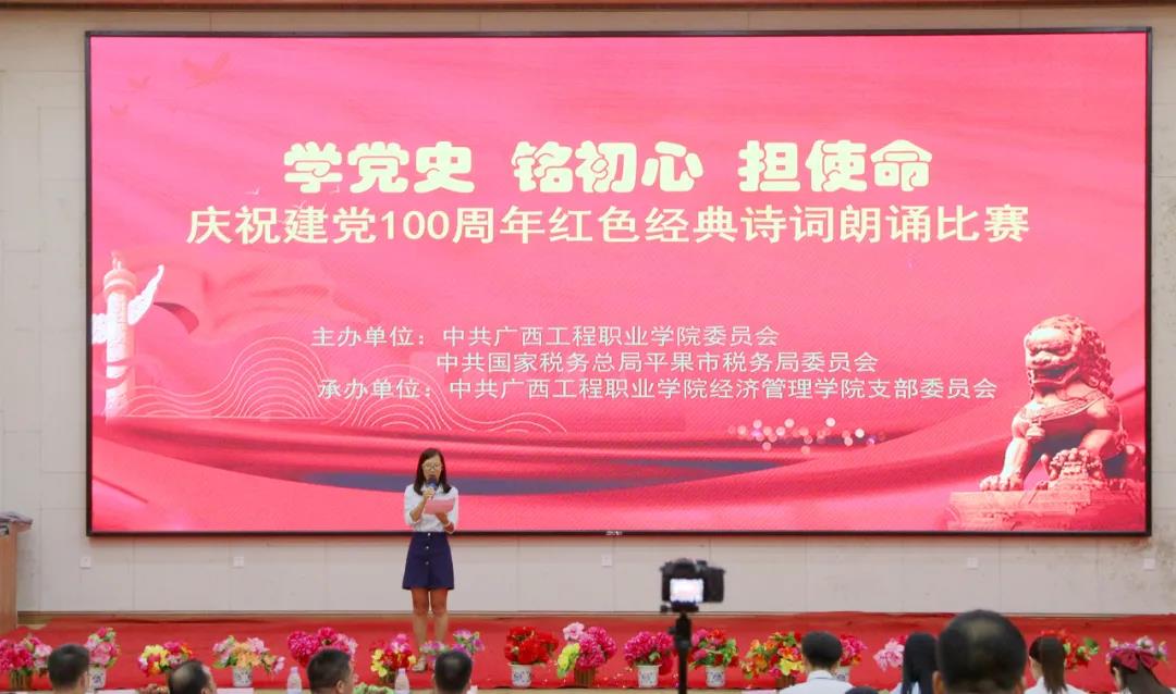 為慶祝中國(guó)共產(chǎn)黨成立100周年,傳承紅色基因,賡續(xù)共產(chǎn)黨人精神血脈,進(jìn)一步激發(fā)大學(xué)生的愛黨愛國(guó)愛社會(huì)主義情懷。6月29日晚,由中共廣西工程職業(yè)學(xué)院委員會(huì)、中共國(guó)家稅務(wù)總局平果市稅務(wù)局委員會(huì)聯(lián)合主辦,中共廣西工程職業(yè)學(xué)院經(jīng)濟(jì)管理學(xué)院支部委員會(huì)承辦的“學(xué)黨史、銘初心、擔(dān)使命,慶祝建黨100周年紅色經(jīng)典詩(shī)詞朗誦比賽”在學(xué)校圖文信息大樓報(bào)告廳舉行。