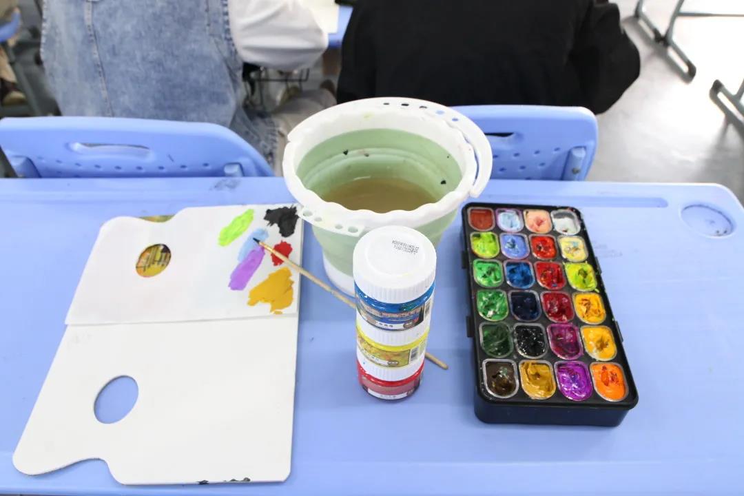 各種顏色的顏料水彩、調(diào)色盤(pán)、畫(huà)筆、