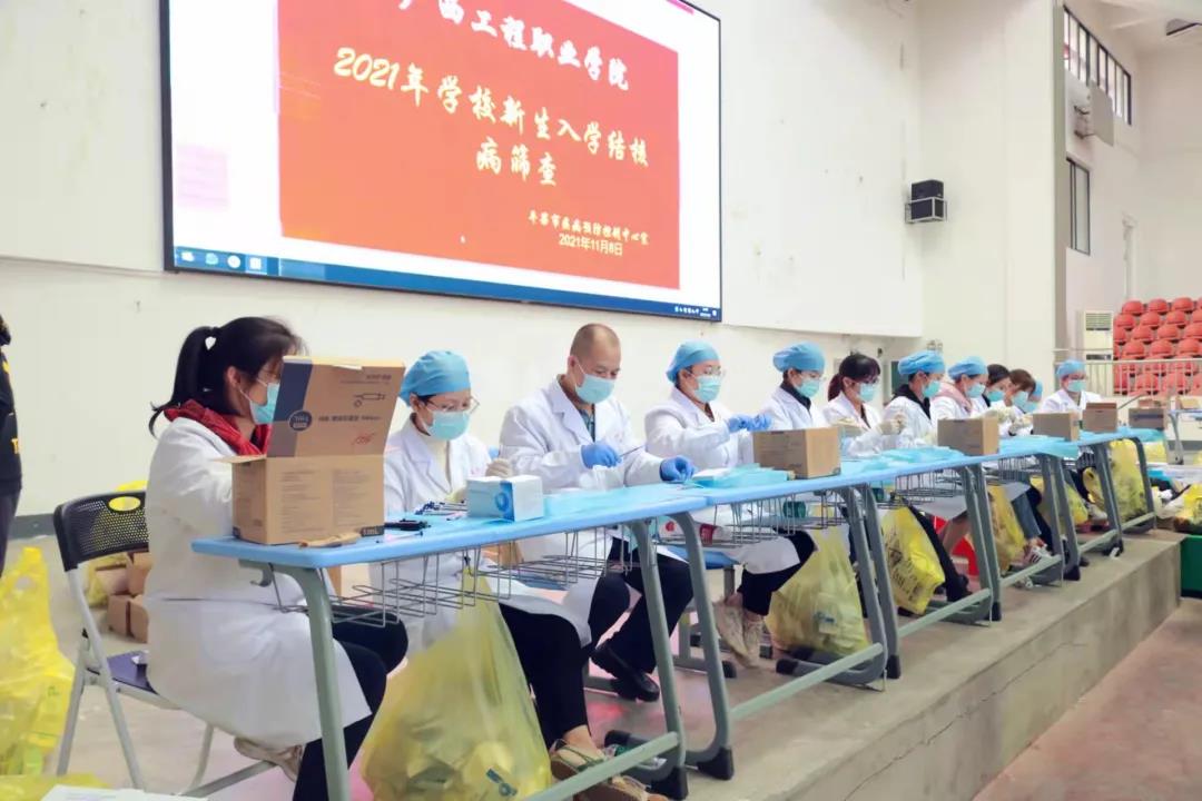 在學(xué)校教務(wù)處、學(xué)生工作處和各二級學(xué)院的大力支持和配合下,平果市人民醫(yī)院在我校體育館為2021級新生及教職工進(jìn)行結(jié)核病篩查工作。