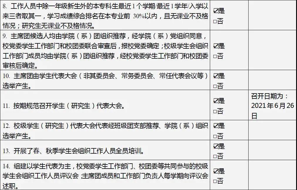 (四)對(duì)校學(xué)生會(huì)成員工作情況進(jìn)行考察,定期向校黨委、校團(tuán)委和校學(xué)生會(huì)工作人員所在學(xué)院匯報(bào)工作情況。