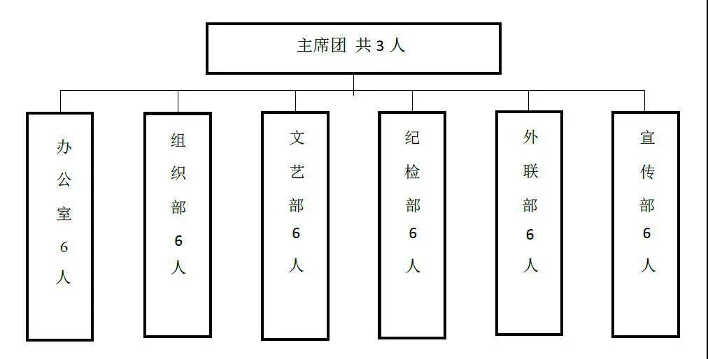 第二十條 校學(xué)生會(huì)各工作部門(mén)是學(xué)生會(huì)的辦事機(jī)構(gòu),對(duì)主席團(tuán)負(fù)責(zé)。根據(jù)工作需要,校學(xué)生會(huì)設(shè)以下部門(mén):辦公室、組織部、文藝部、紀(jì)檢部、外聯(lián)部、宣傳部。各工作部門(mén)設(shè)部長(zhǎng)1名,副部長(zhǎng)若干名,干事若干名。學(xué)生會(huì)工作人員總?cè)藬?shù)不超過(guò) 40 人。