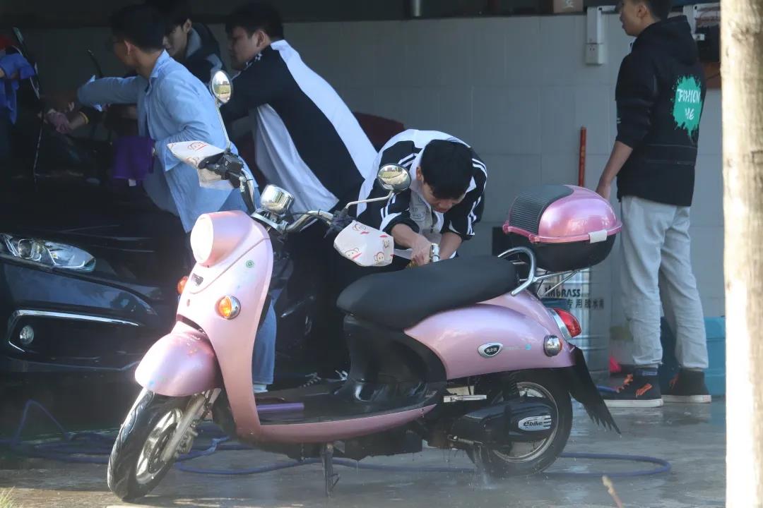 現(xiàn)場的學(xué)生志愿者們?cè)诶蠋煹闹敢路止っ鞔_,從接待、噴水、噴灑泡沫、沖洗、擦干到交車,大家熱情高漲,每個(gè)環(huán)節(jié)都有條不紊地進(jìn)行著,同學(xué)們以勞動(dòng)為榮,樂在其中,力爭為老師們提供優(yōu)質(zhì)又專業(yè)的暖心服務(wù)。