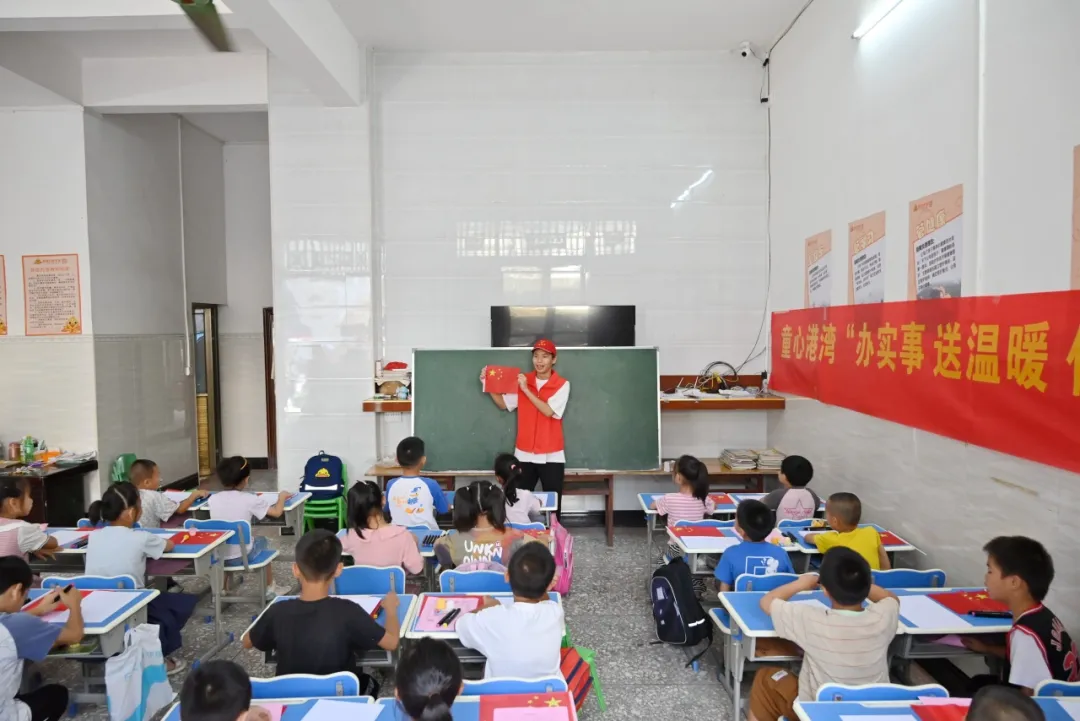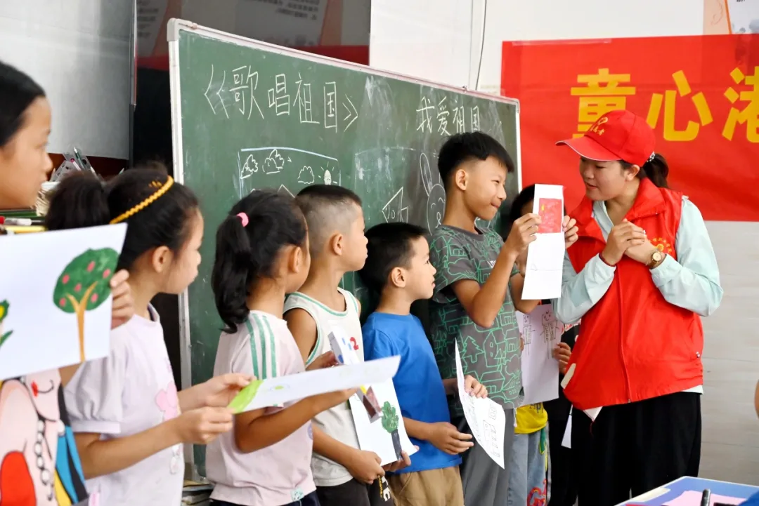 實(shí)踐團(tuán)、服務(wù)團(tuán)成員開展了“童心港灣‘辦實(shí)事 送溫暖 傳真情’”主題活動(dòng)?;顒?dòng)中,志愿者們教小孩子唱歌、朗誦、畫畫,以《歌唱祖國(guó)》《我愛祖國(guó)》等為主題,慶祝今年新中國(guó)成立75周年,增強(qiáng)孩子們的愛國(guó)意識(shí);同時(shí)還給孩子們送上五顏六色的文具、水杯、雨傘、糖果、筆記本等愛心紀(jì)念品,整個(gè)活動(dòng)充滿歡聲笑語。