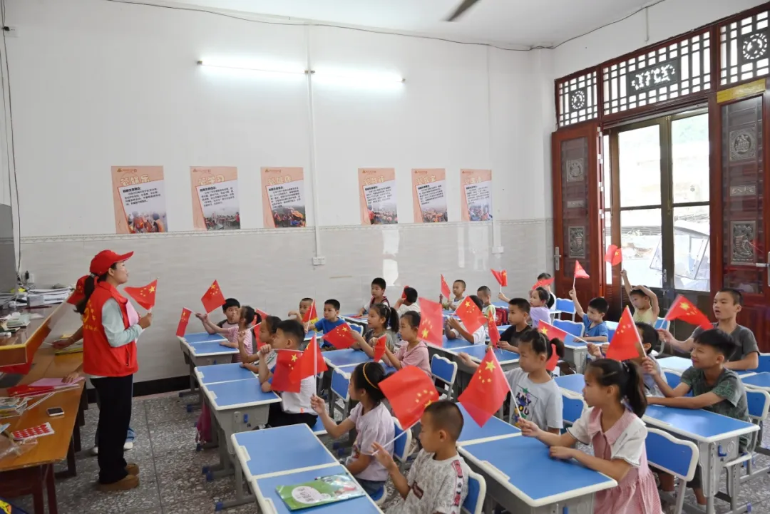 實(shí)踐團(tuán)、服務(wù)團(tuán)成員們耐心教小朋友們唱歌、畫畫、朗誦,現(xiàn)場(chǎng)洋溢著學(xué)習(xí)的歡樂和濃厚的愛國(guó)情感
