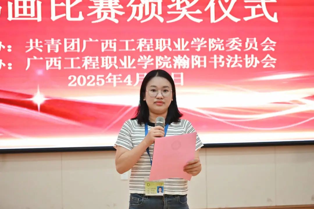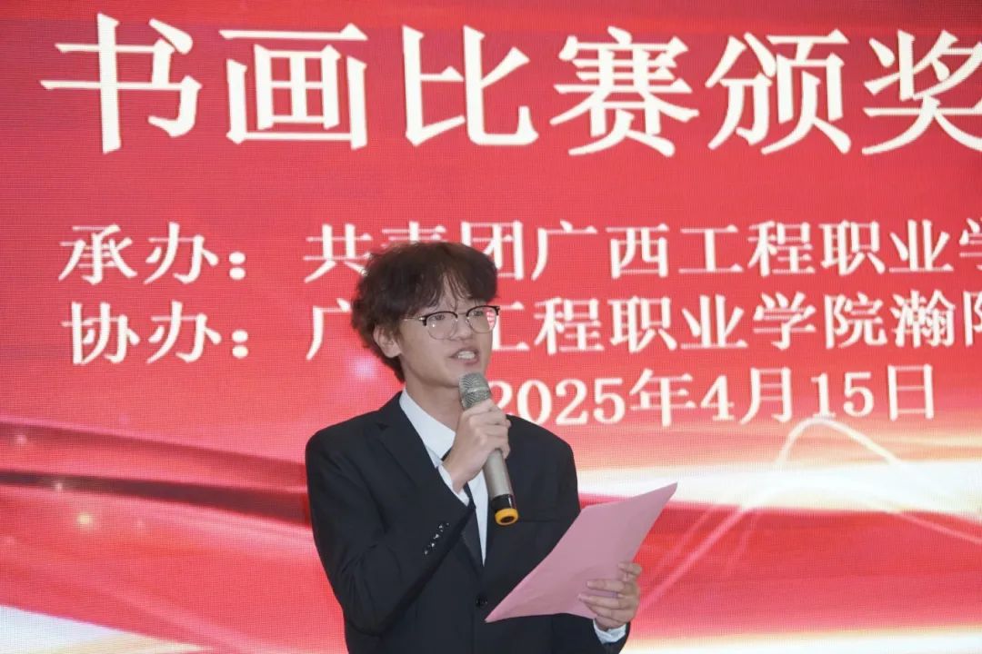 副校長黃德偉致辭,他指出,學(xué)校從建校之初到如今的桃李芬芳,始終秉承“厚德博學(xué),至材健行”的校訓(xùn)精神,在傳承中創(chuàng)新,在耕耘中收獲。此次校慶書畫比賽的成功舉辦,既是對學(xué)校十八年風(fēng)雨歷程的深情禮贊,又展現(xiàn)了同學(xué)們的藝術(shù)才華和精神風(fēng)貌。他鼓勵同學(xué)們通過藝術(shù)鑒賞與創(chuàng)作不斷提升個人文化修養(yǎng)、美育素養(yǎng),積極參與校園文化建設(shè),共同書寫廣西工程職業(yè)學(xué)院新篇章。