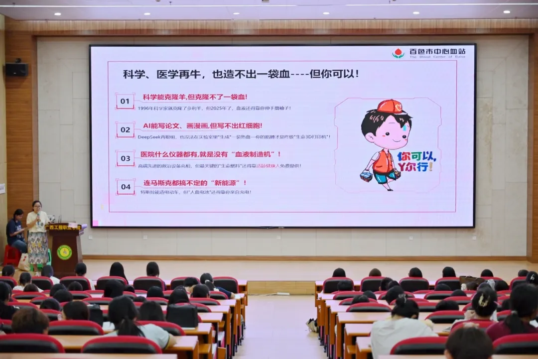 本次宣講由百色市中心血站獻血服務(wù)科副科長鄭寧主講。她以“科學(xué)與醫(yī)學(xué)的局限性”為切入點,圍繞科學(xué)能克隆羊,但克隆不了一袋血;AI能寫論文、畫漫畫,但寫不出紅細胞;醫(yī)院什么儀器都有,就是沒有“血液制造機”;連馬斯克都搞不定的“興能源”等主要內(nèi)容來宣講。