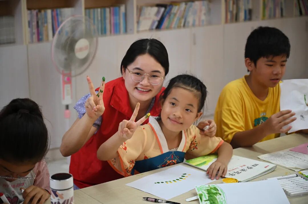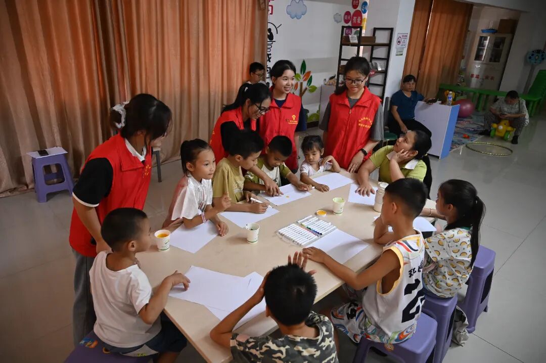 在繪畫課堂上,實(shí)踐團(tuán)成員為孩子們準(zhǔn)備了豐富的繪畫工具,鼓勵(lì)他們用畫筆描繪美好的祖國(guó)。