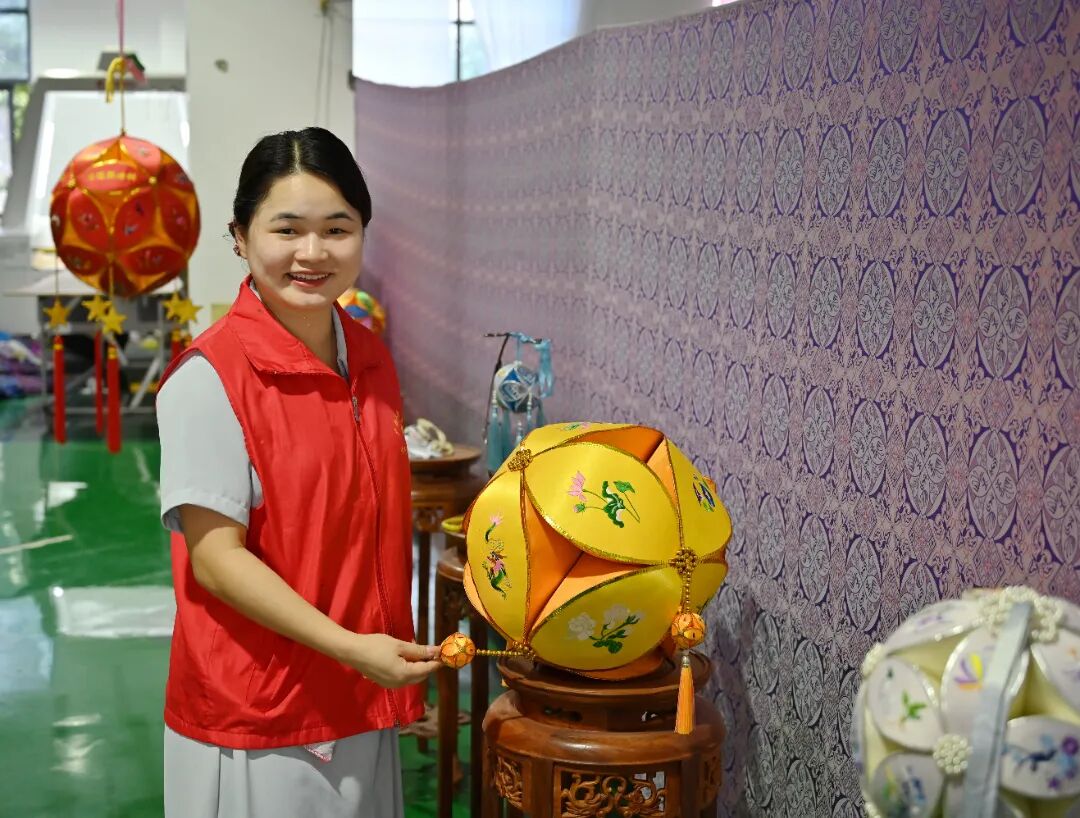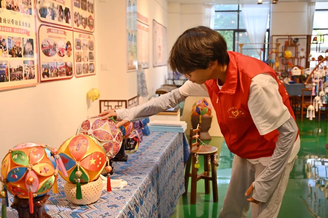 現(xiàn)場工作人員向?qū)嵺`團介紹繡球的制作過程