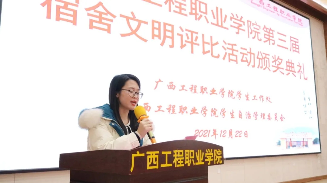 會上,黃秋霞助理講話,她對各二級學(xué)院有關(guān)領(lǐng)導(dǎo)干部、教師、同學(xué)對文明宿舍建設(shè)工作的大力支持和狠抓落實表示衷心的感謝。黃助理希望同學(xué)們充分認(rèn)識創(chuàng)建文明宿舍的重要意義,提高參與意識,自覺提升自我管理、自我教育、自我服務(wù)意識,積極投入到創(chuàng)建活動中去,并要求各位宿舍舍長繼續(xù)做好寢室各項工作,團結(jié)好同學(xué)、服務(wù)好同學(xué),共同創(chuàng)建文明宿舍、和諧宿舍,為創(chuàng)建文明校園貢獻力量。