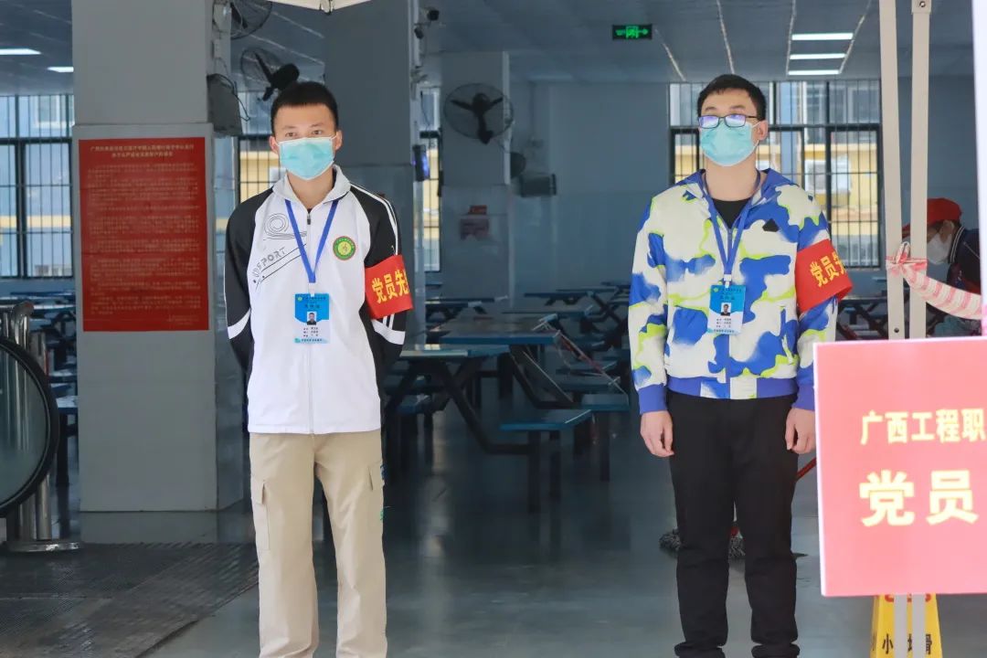 各食堂門口設(shè)置黨員先鋒崗,進(jìn)行測(cè)溫等疫情防控工作