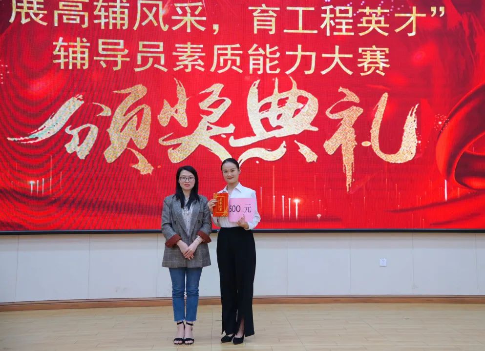 楊竟、梁欣欣副院長(zhǎng)分別為榮獲優(yōu)勝獎(jiǎng)的輔導(dǎo)員頒獎(jiǎng)