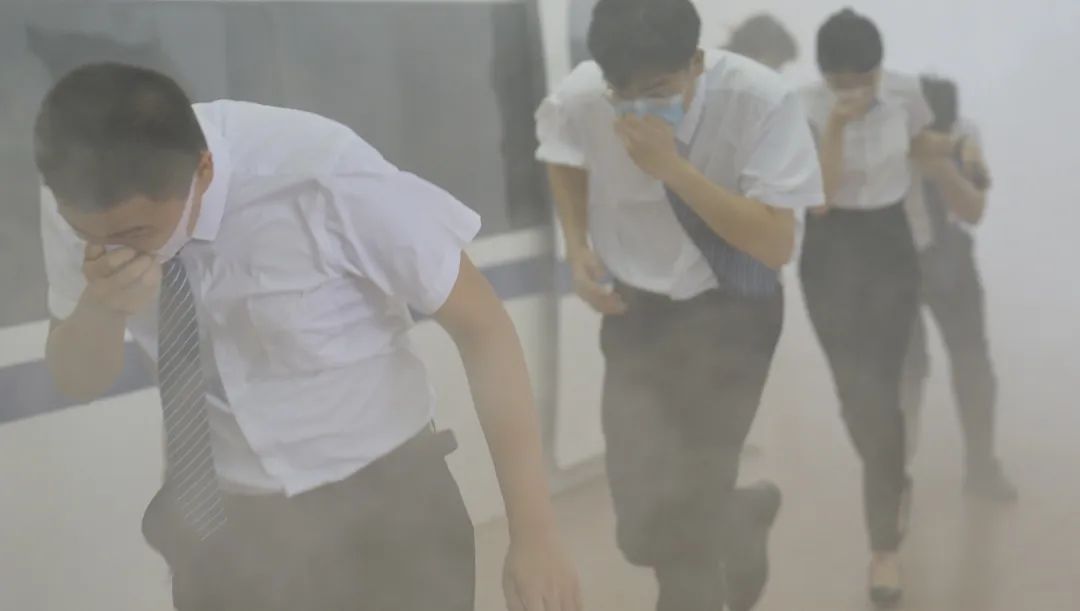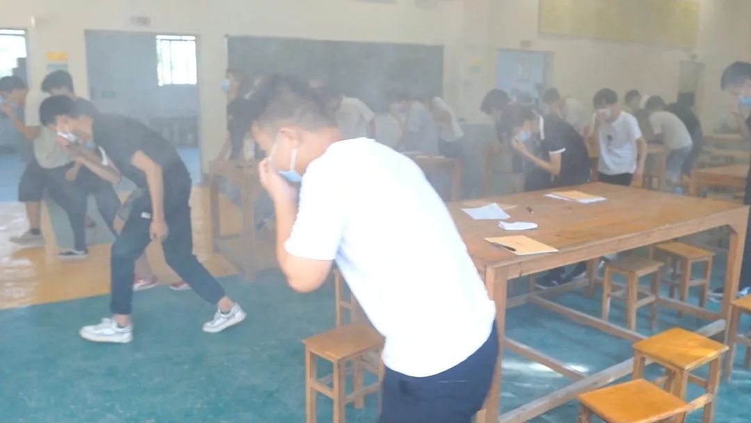同學(xué)們手持濕毛巾掩住口鼻,采取低姿勢