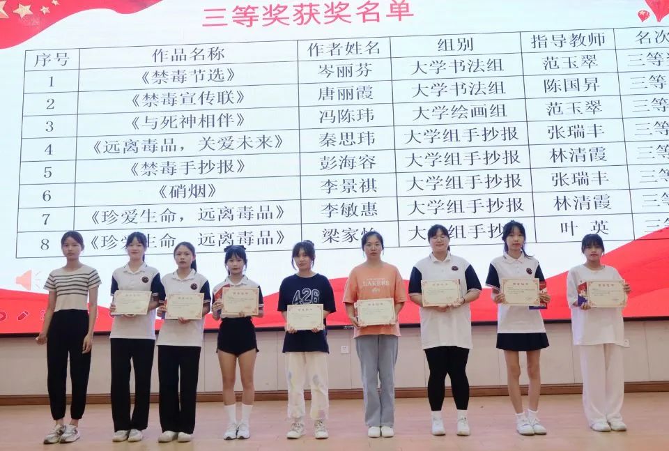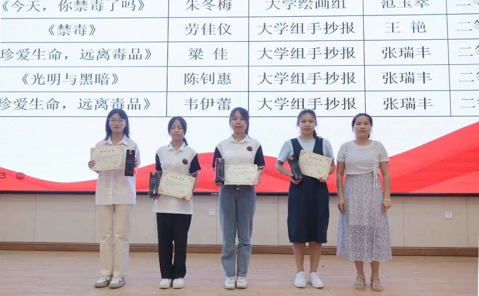 教育學(xué)院黨支部書記盧燕梅為獲得“青少年禁毒文藝作品大賽”二等獎的同學(xué)頒獎