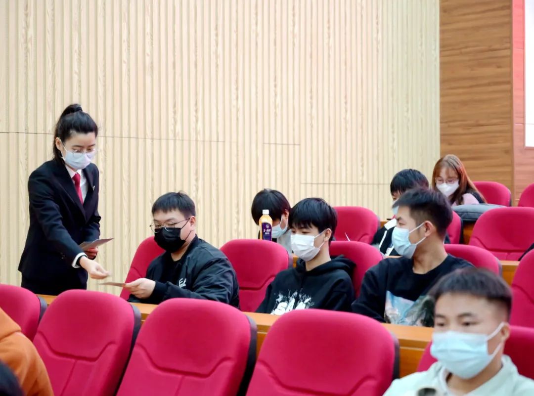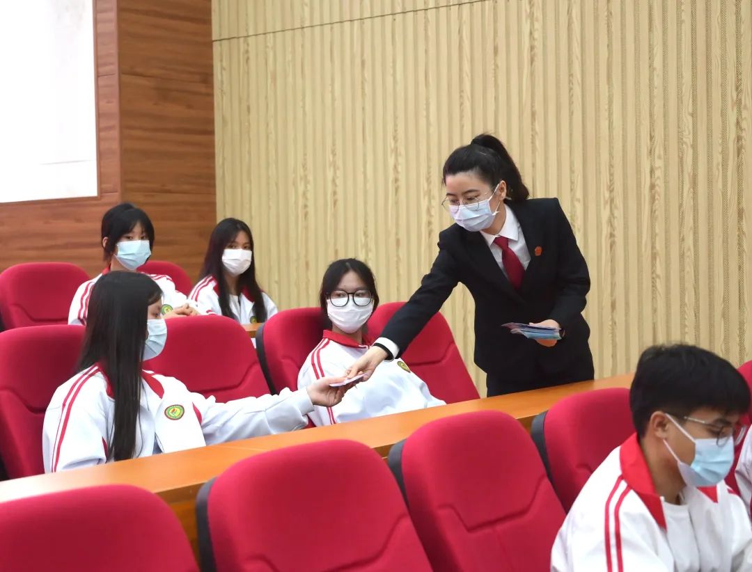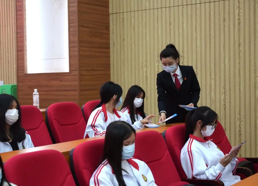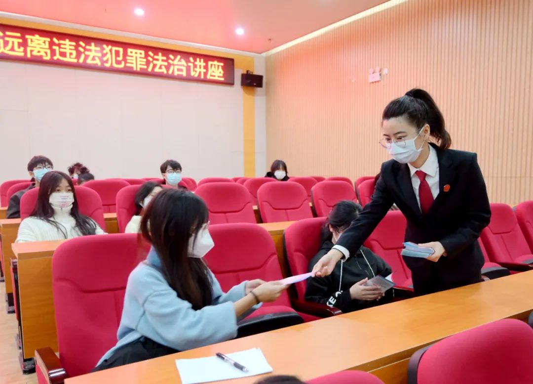 講座現(xiàn)場,法院干警向?qū)W生發(fā)放法治宣傳資料,讓學(xué)生們進一步學(xué)習(xí)法律知識。