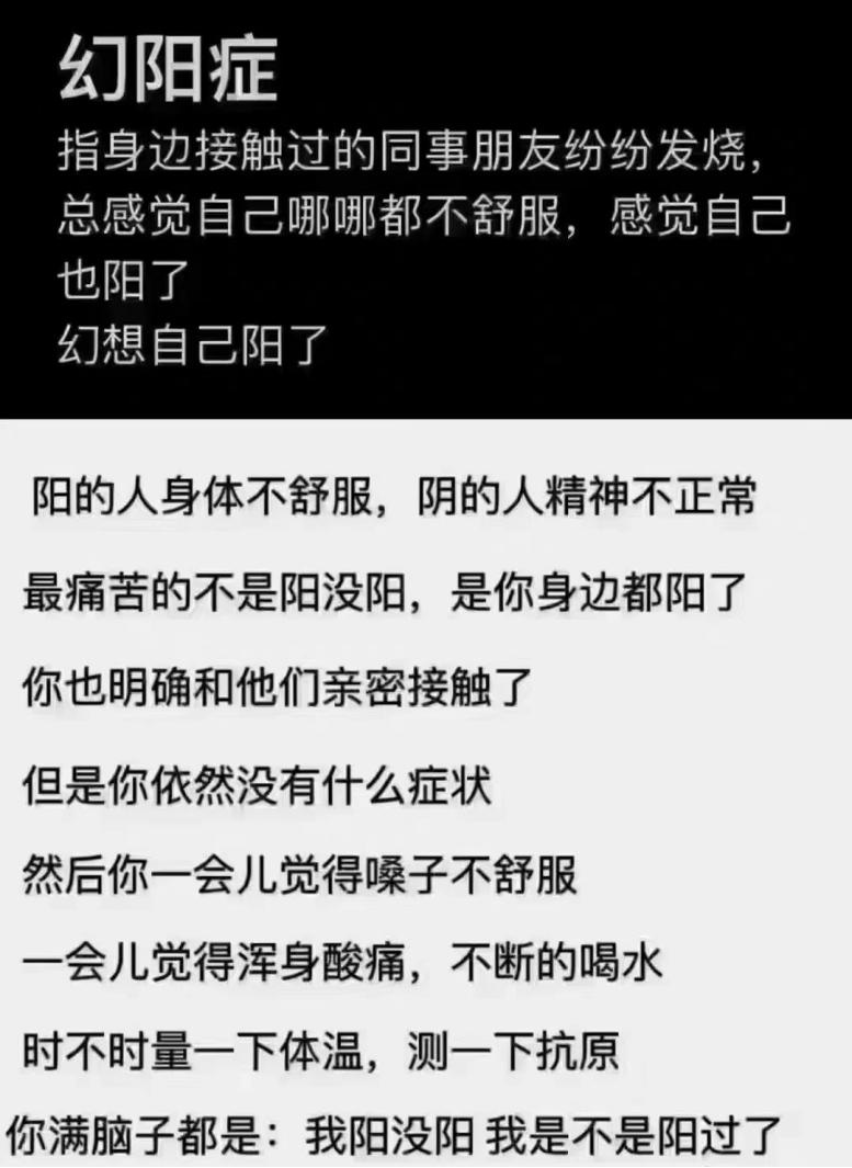 在這樣“陽了個陽”的形勢下,似乎除了奧密克戎,還有一種新的“不明疾病”——“幻陽癥”也在慢慢流行起來。有網(wǎng)友貼心地整理了“幻陽癥”的名詞解釋和“癥狀表現(xiàn)”,還有不少網(wǎng)友表示自己出現(xiàn)了此“疾病”的諸多“癥狀”。