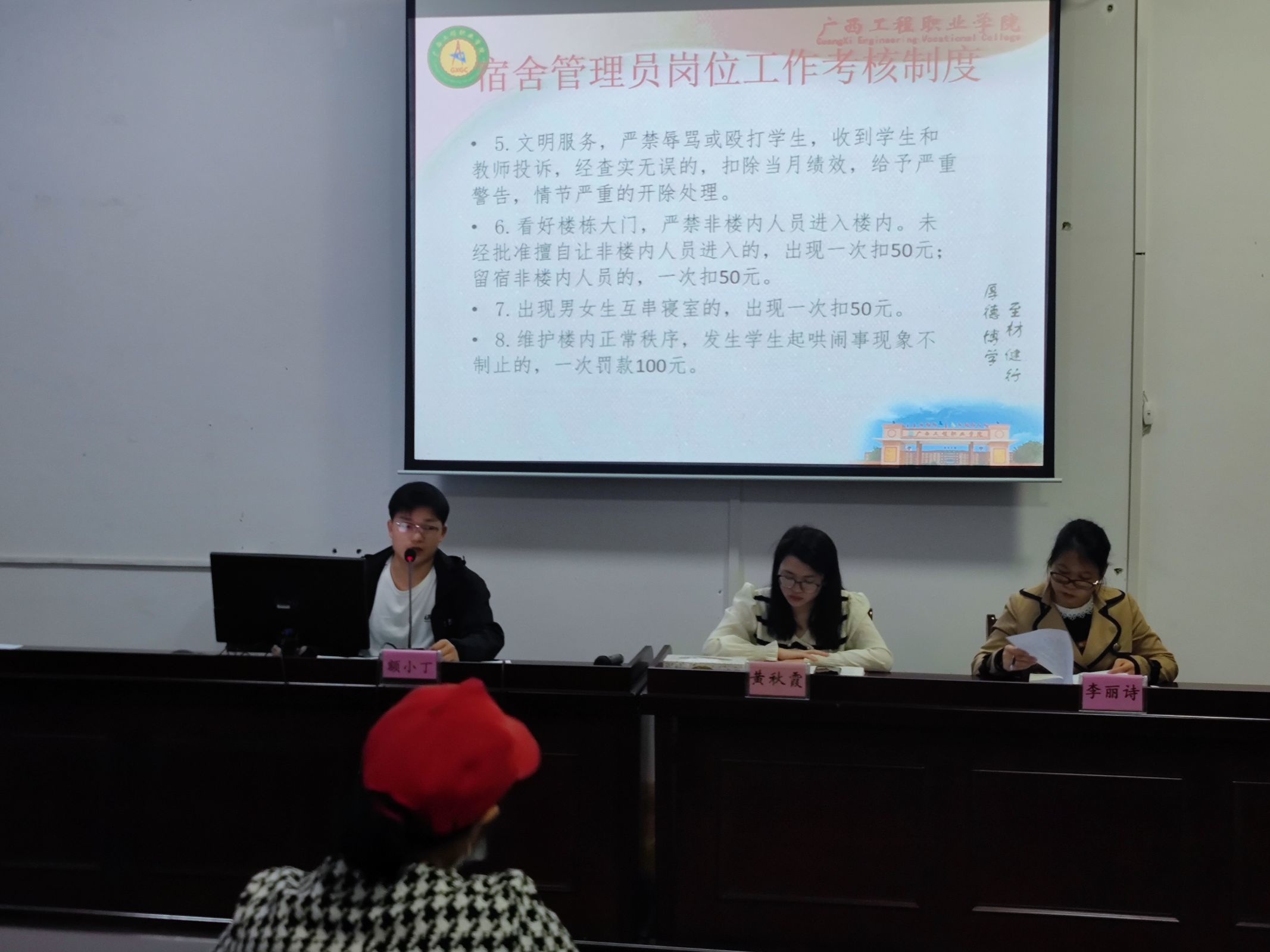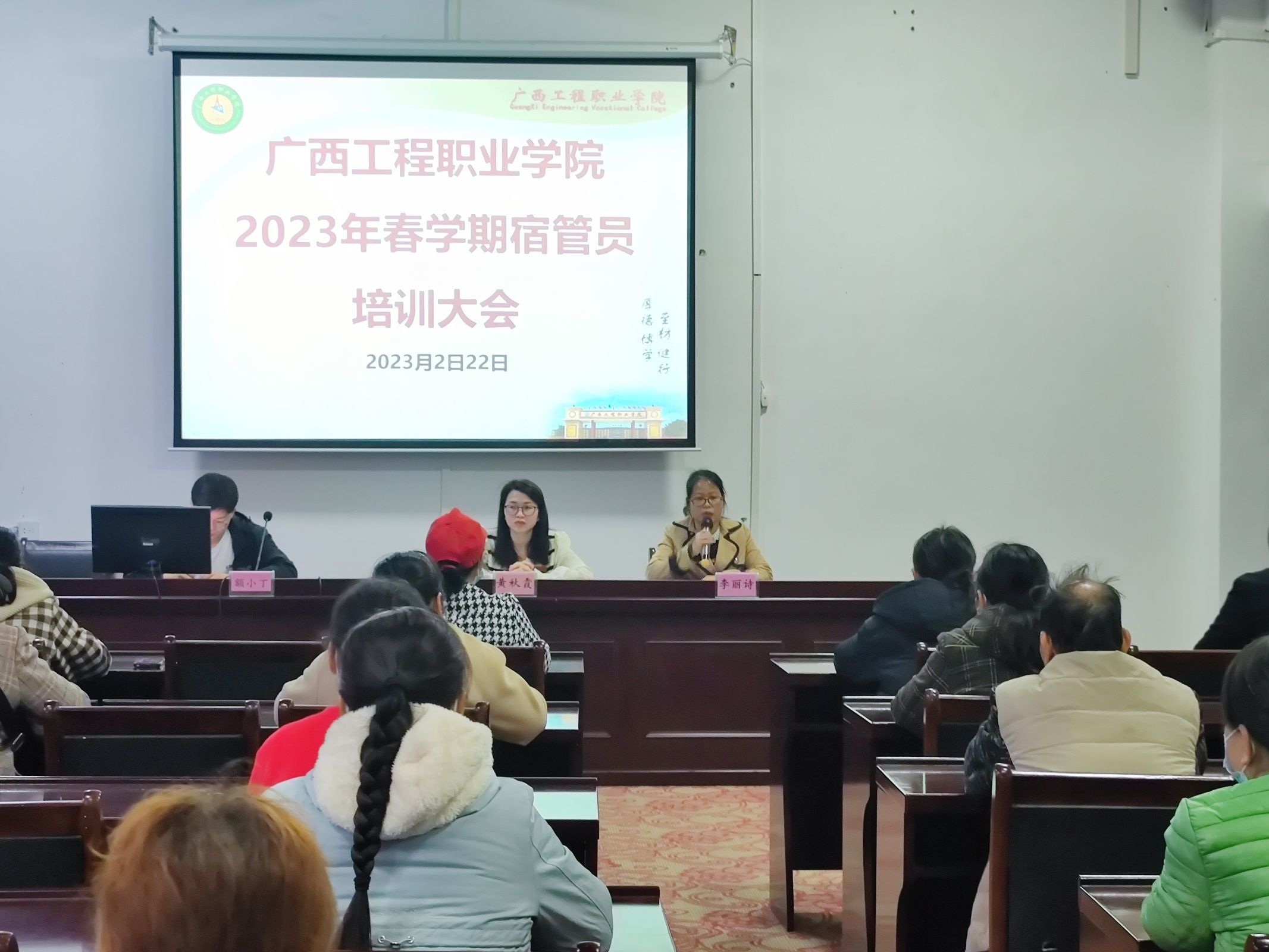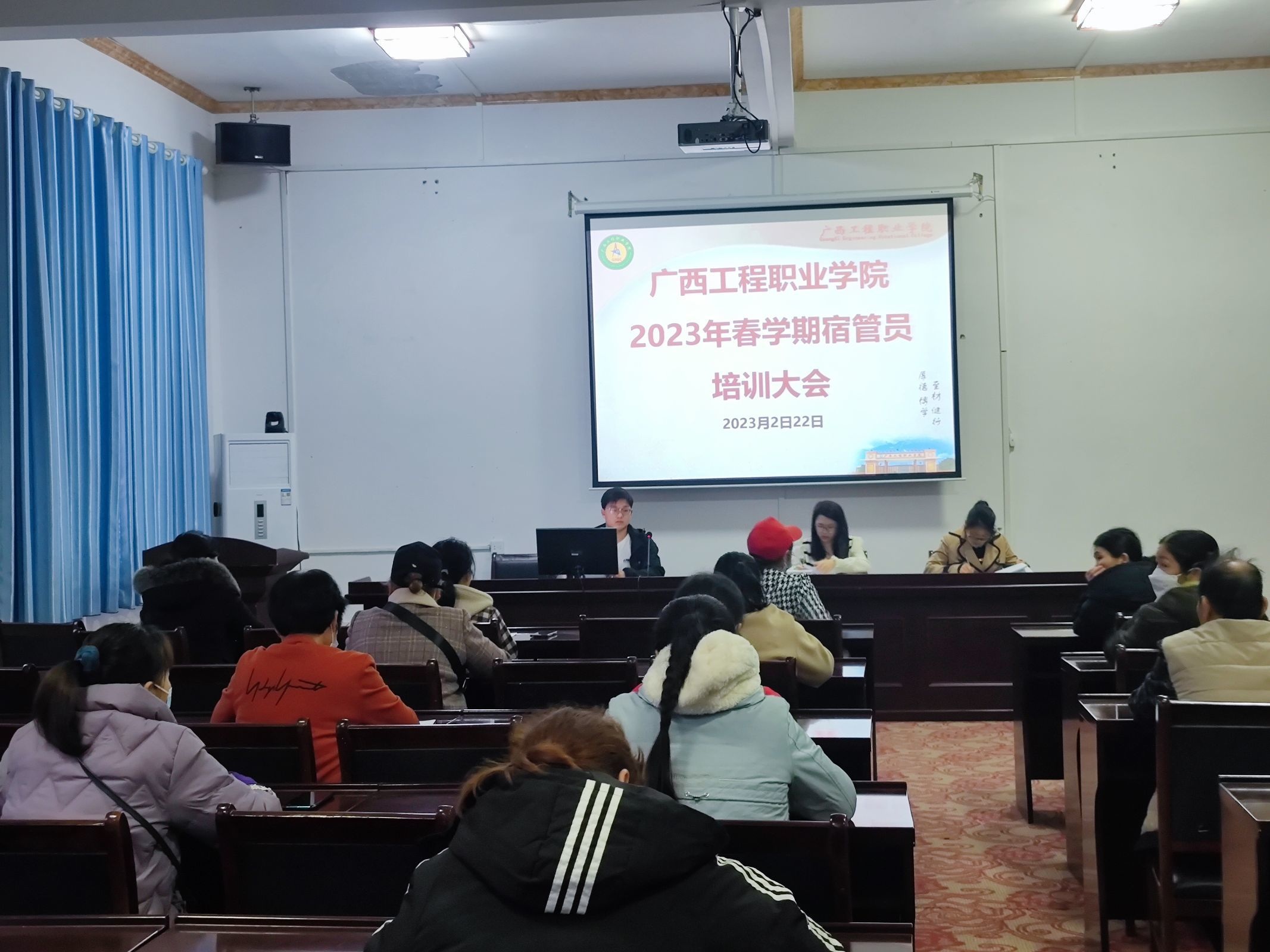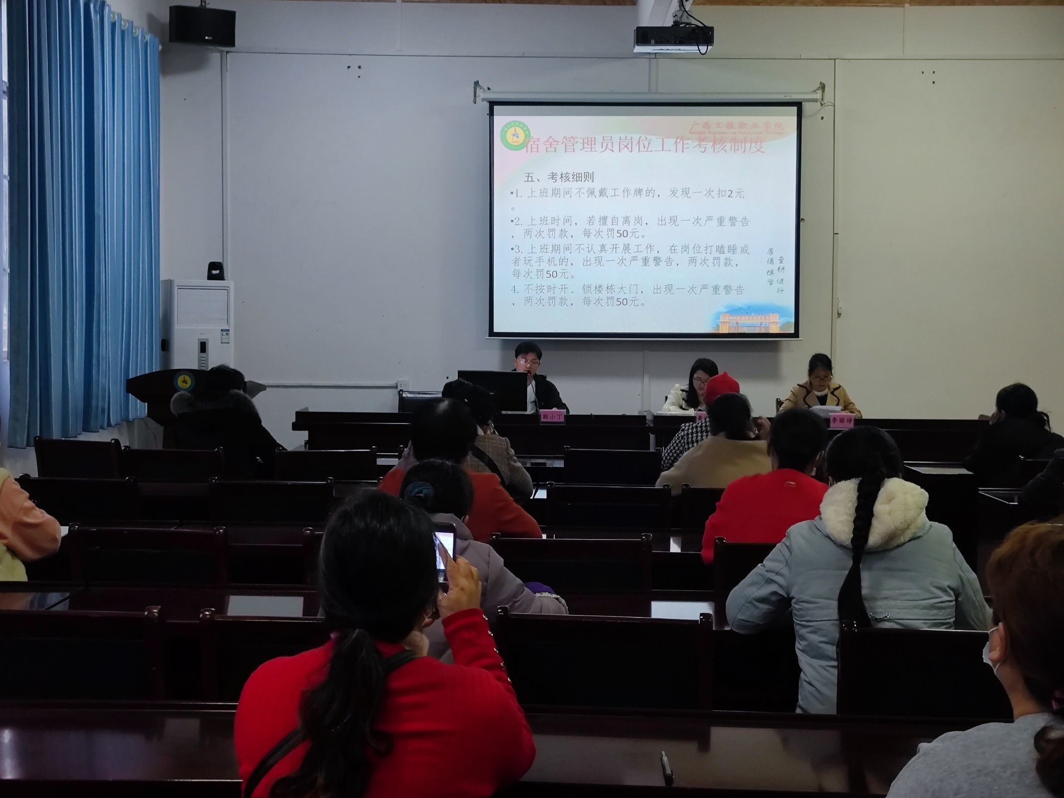 為加強(qiáng)學(xué)生宿舍管理人員隊(duì)伍建設(shè),全面提升宿舍管理員的管理水平和整體素質(zhì),增強(qiáng)安全意識(shí)、服務(wù)意識(shí),進(jìn)一步提高宿舍管理工作方法,2月22日,學(xué)生工作處在圖書館一樓學(xué)術(shù)報(bào)告廳組織開展了全體宿舍管理人員業(yè)務(wù)能力提升培訓(xùn)會(huì),學(xué)校黨委副書記黃秋霞出席會(huì)議,學(xué)生工作處副處長(zhǎng)李麗詩(shī)、學(xué)生工作處宿管科額小丁老師及全體宿管員參加會(huì)議。