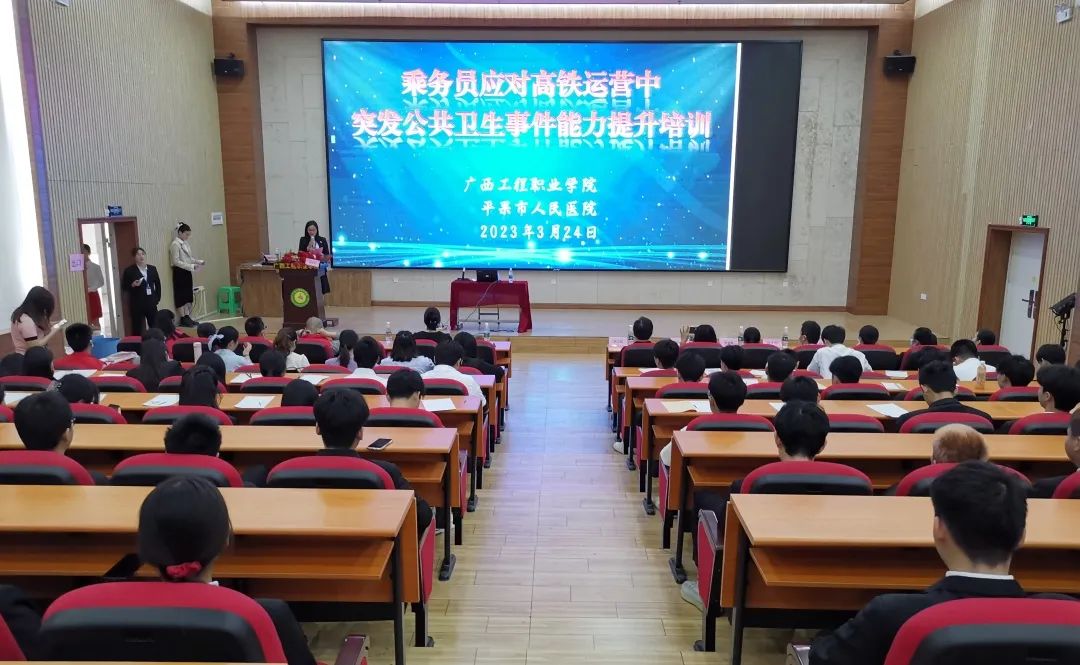 為進一步提升高速鐵路客運服務專業(yè)學生的應急處置能力、應急處理的協(xié)調(diào)配合以及保障應急處置的效果,有效預防、及時控制和消除突發(fā)公共衛(wèi)生事件的危害,為鐵路企業(yè)培養(yǎng)出具有一定應急處理能力的、高素質(zhì)技術(shù)技能人才,鐵道與航空學院聯(lián)合平果市人民醫(yī)院于3月24日下午在校圖文信息大樓一樓學術(shù)報告廳開展乘務員應對高鐵運營中突發(fā)公共衛(wèi)生事件能力提升培訓活動暨平果市人民醫(yī)院健康知識進校園文明實踐志愿服務活動 。 鐵道與航空學院黨支部書記、院長覃鳳姣,平果市人民醫(yī)院骨外科副主任蘇衛(wèi)松、平果市人民醫(yī)院第二十黨支部書記宋麗紅、平果市人民醫(yī)院第十六黨支部組織委員黃春梅、平果市人民醫(yī)院第十六黨支部楊才印醫(yī)師、平果市人民醫(yī)院感染性疾病科郭欣欣醫(yī)師等出席了活動現(xiàn)場。鐵道與航空學院師生代表參加了活動。