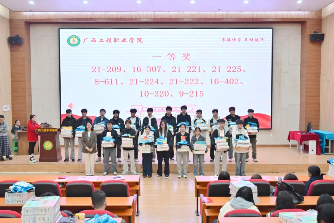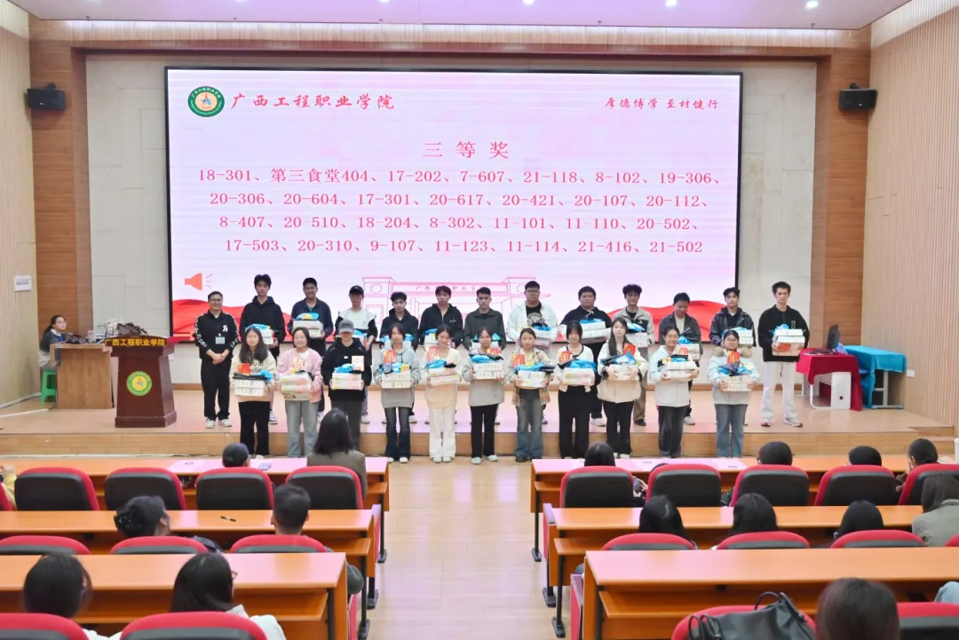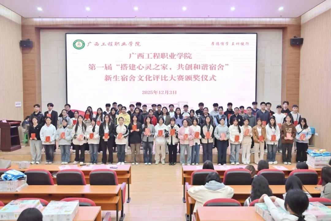 為營(yíng)造溫馨向上的宿舍氛圍,幫助2025級(jí)新生融入宿舍集體生活,廣西工程職業(yè)學(xué)院舉行第一屆以“搭建心靈之家,共創(chuàng)和諧宿舍”為主題的新生宿舍文化評(píng)比活動(dòng)。活動(dòng)于2025年10月20日啟動(dòng),由學(xué)生工作處承辦。評(píng)比活動(dòng)歷時(shí)一個(gè)多月,經(jīng)過院級(jí)初賽、校級(jí)決賽,最終評(píng)選出一等獎(jiǎng)10個(gè)宿舍、二等獎(jiǎng)21個(gè)宿舍、三等獎(jiǎng)28個(gè)宿舍。頒獎(jiǎng)儀式于2025年12月3日在圖文信息大樓一樓報(bào)告廳舉行。