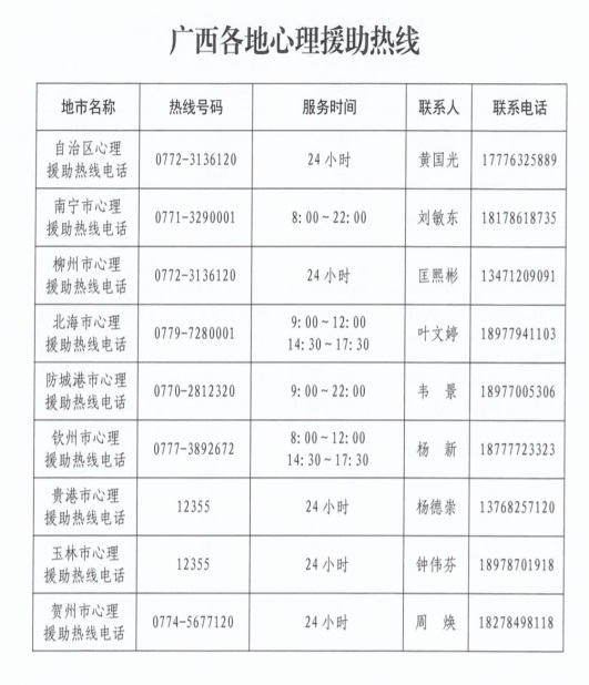 4.暢通咨詢熱線。輔導員轉(zhuǎn)發(fā)教育部心理援助熱線、廣西心理援助熱線以及區(qū)內(nèi)各高校的心理支持熱線幫助師生有效排解疫情下的心理壓力。并轉(zhuǎn)發(fā)我校學生工作處大學生心理健康教育與咨詢中心電話:0776-5728789。
