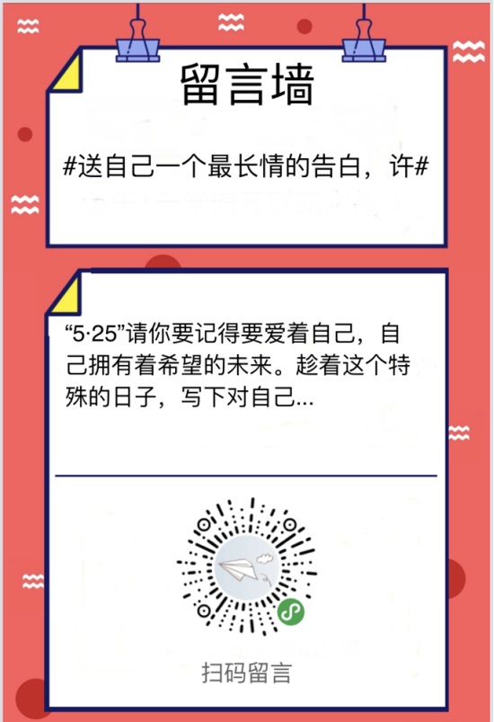 5.開展線上留言墻活動。在微信小程序中“送自己一個最長情的告白,許自己一個最美好的未來”留言墻中,留下對自己的告白,許下對未來的美好期冀。