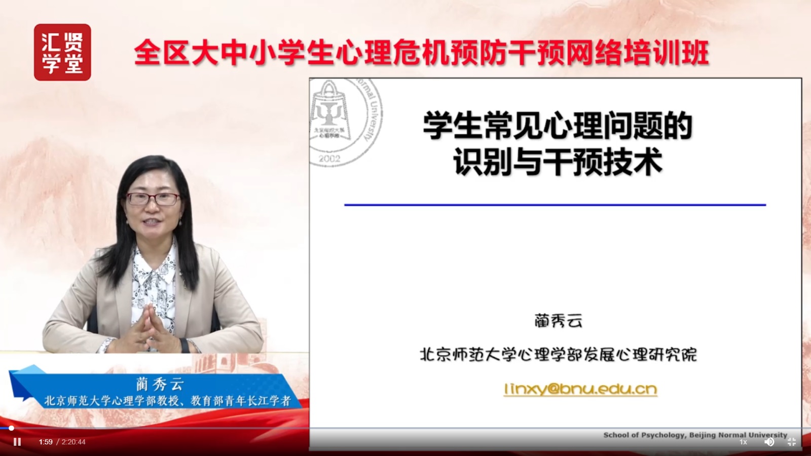 此次網(wǎng)絡(luò)培訓(xùn)一共有兩場(chǎng),第一場(chǎng)為北京師范大學(xué)心理學(xué)部教授、博士生導(dǎo)師、教育部青年長(zhǎng)江學(xué)者藺秀云教授講授關(guān)于《學(xué)生常見(jiàn)心理問(wèn)題的識(shí)別與干預(yù)技術(shù)》的課程。