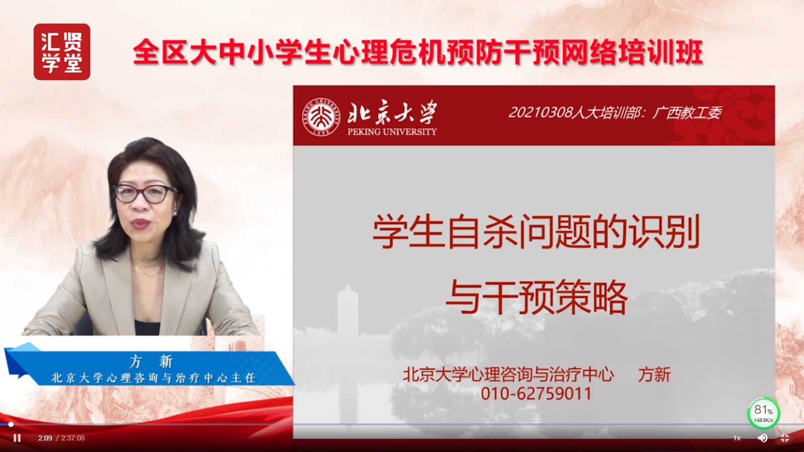 第二場(chǎng)培訓(xùn)為北京大學(xué)醫(yī)院心理治療與咨詢(xún)中心主任方新老師講授關(guān)于《學(xué)生自殺問(wèn)題識(shí)別與干預(yù)策略》的課程。