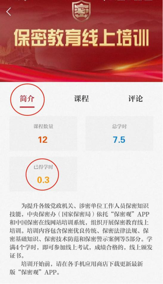 2.學(xué)習(xí)課程。進入系統(tǒng),點擊“課程”開始學(xué)習(xí)。課程內(nèi)容包含保密優(yōu)良傳統(tǒng)、保密法律法規(guī)、保密知識常識、保密技術(shù)防范和保密警示案例5部分,分為視頻和音頻兩種形式,合計7.5學(xué)時。