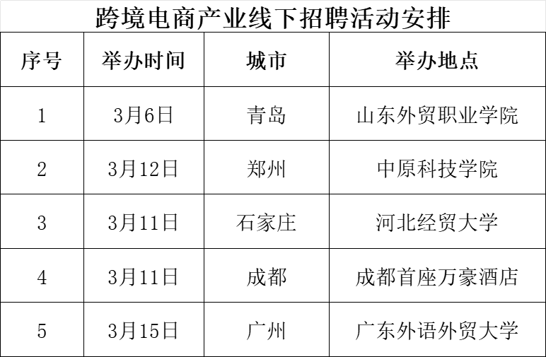 內(nèi)容:5場線下跨境電商產(chǎn)業(yè)線下招聘活動,提供面對面交流機會,助力大家與用人單位直接對接。