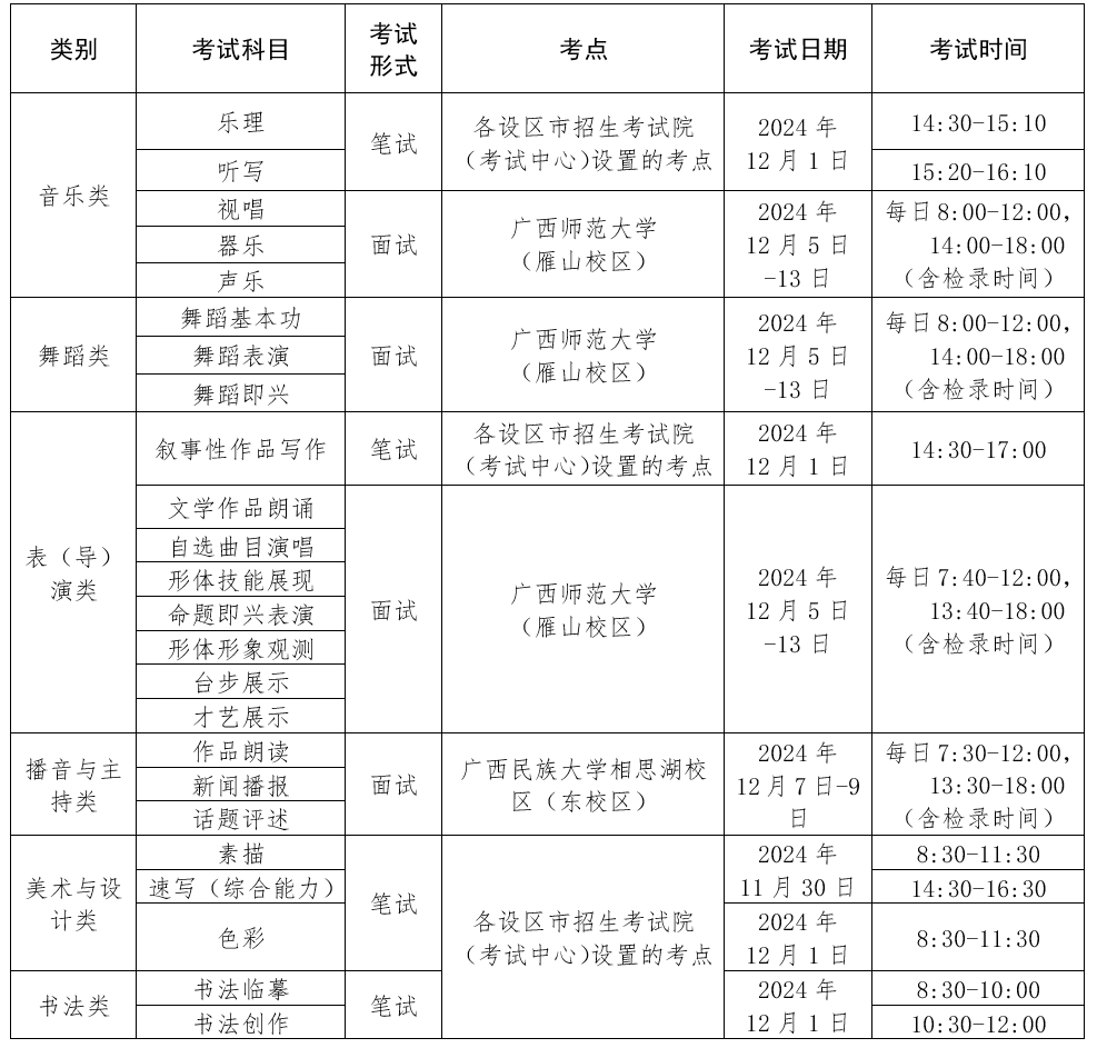 (一)音樂類。筆試科目(樂理、聽寫):2024年12月1日下午;面試科目(視唱、器樂、聲樂):2024年12月5日至13日。