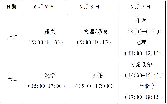 (二)考試時(shí)間。全國統(tǒng)考科目由教育部命題,按教育部規(guī)定時(shí)間組織考試。選擇性考試科目由我區(qū)自主命題,每門考試時(shí)長均為75分鐘,與全國統(tǒng)考科目的考試同期安排,如全國統(tǒng)考科目有調(diào)整,選擇性考試科目的考試安排相應(yīng)調(diào)整。具體考試時(shí)間安排如下: